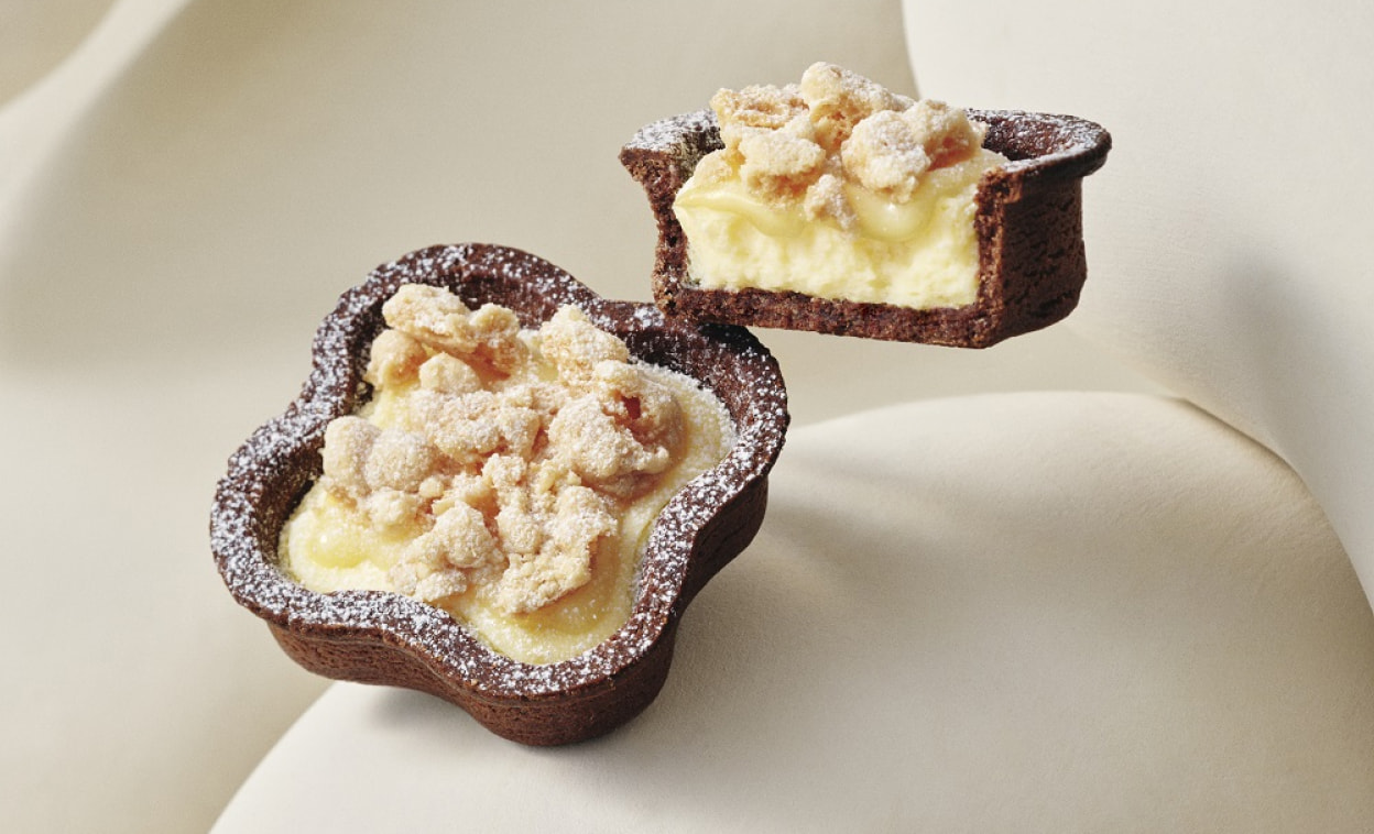 北海道産マスカルポーネチーズムースに、やさしい甘さのミルクソースを重ねたミルク感たっぷりな味わいのチーズタルト。ココアとアーモンドパウダーを練り込んだザクっと香ばしいタルトカップが、心地よい食感のアクセントに。仕上げにサクサクのクランブルをトッピングしました。奥深い味わいと食感のコントラストをお楽しみください。